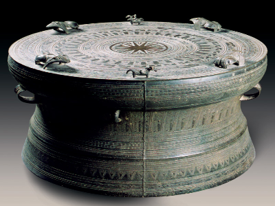 此铜鼓出土于广西藤县,直径77厘米,高53。5厘米,重量32。5公斤,铜质,汉代,为壮族先民所铸。铜鼓呈圆墩形,造型接近黄金分割比例,花纹密集精美,给人饱满、优美、圆润的美感。鼓面上的太阳纹为十二芒,象征光明和神力,寓意天堂,鼓身变形的羽人纹和船形纹代表人间,鼓足上的垂叶纹和水波纹代表水,寓意阴间。鼓面有四只青蛙立体塑像,并有一大一小乘骑塑像。纹饰有阳光照耀、微风吹拂、碧波荡漾、晴空万里、白鹭飞翔、青蛙跳跃、乘骑徐行、飞舟竞渡、聚乐人群等,充满生活气息和诗情画意。此铜鼓是已出土文物冷水冲型铜鼓中的上乘之作。
