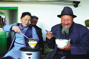 朱兴德高兴地端起多尔吉·哈扎汗盛的饭。 孙伟霞摄