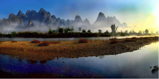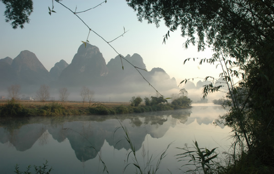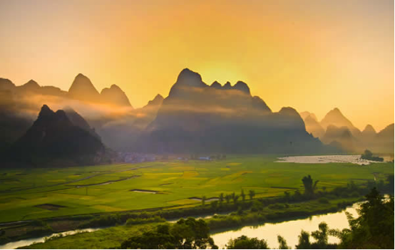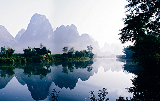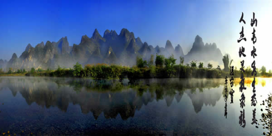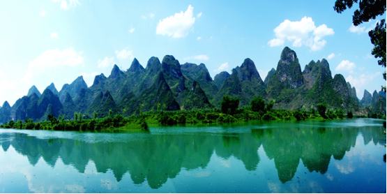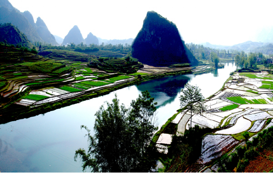 盘阳河是广西巴马的母亲河,长寿河,甲篆村在巴马县西北18公里处,甲篆乡政府驻地,巴马至凤山公路经此,盘阳河从距村址约2公里烈屯漠斋山的百鸟洞奔流而出,河湾断续,秀水潆洄,两岸奇峰峻峦,村屯错落。似锦的田畴上,如画的河谷中,有酷似桂林山水的碧莲叠彩、书童独秀、榕荫古渡和屏风山,还有坡开老虎山、象山,足乐的孔雀山,以及千绮百丽的大水溶洞。