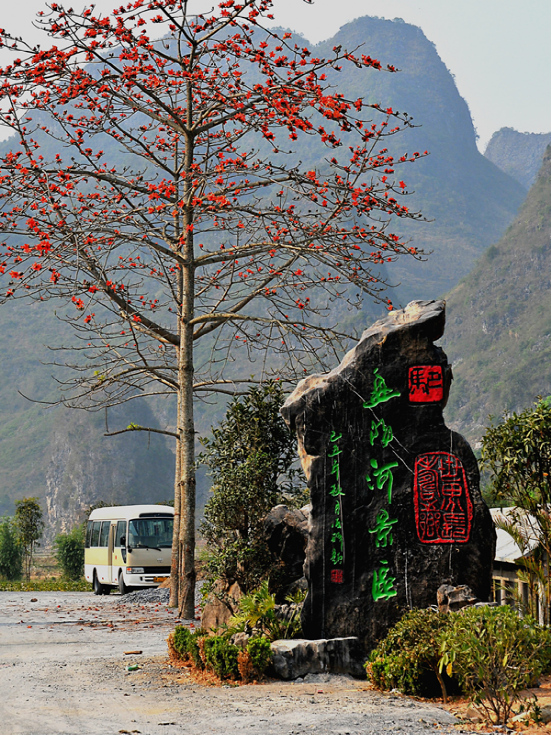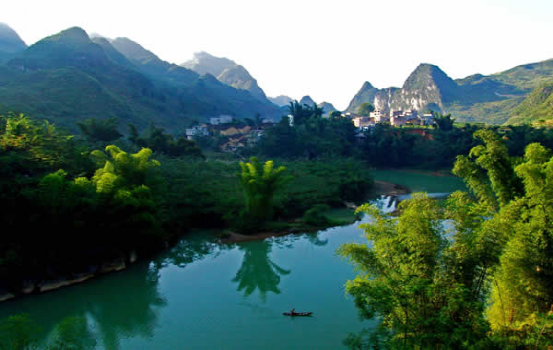 巴马盘阳河位于广西壮族自治区河池市,盘阳河蜿蜒曲折,色若翡翠,清如明镜。两岸青山如黛,风光旖旎。清澈碧绿的湖水犹如一条蓝色的绸带在逶迤峰峦间飘向远方。河中含有丰富的矿物质以及微量元素,对人体有着极大的好处,河的两岸是壮族和瑶族的聚居地,同样也是长寿老人们的聚居地,盘阳河是盘阳老百姓的"福泽河"。巴马的泉水更是享誉世界,被誉为世界珍稀天然矿泉水,有美颜养容的功效,是神奇罕见的"健康水"。长期的水流冲刷形成了巴马独特秀美的喀斯特形貌,溶洞、瀑布、深谷星罗棋布,河溪交织,蕴藏着丰富的自然资源宝藏。盘阳河两岸还生长着大量的红木棉。阳春三月,草长莺飞,杂花生树,火红的木棉像热情的少女的裙摆,舞动在连绵青山中,形成一道亮丽的风景线,美不胜收。