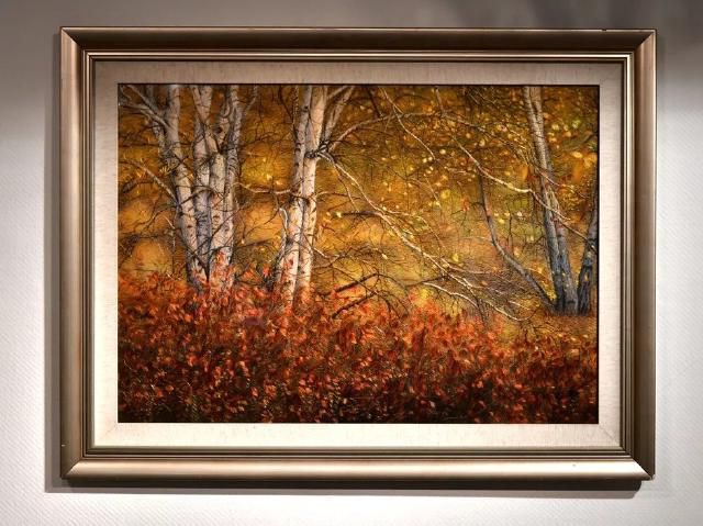 本作品表现的是深秋时节森林金黄,白桦树落叶点点、露出白色枝干的景象。整体绣面用色丰富多彩,炫而不俗;针法灵活多变,层次鲜明,仿佛置身其间,给人以美的享受。