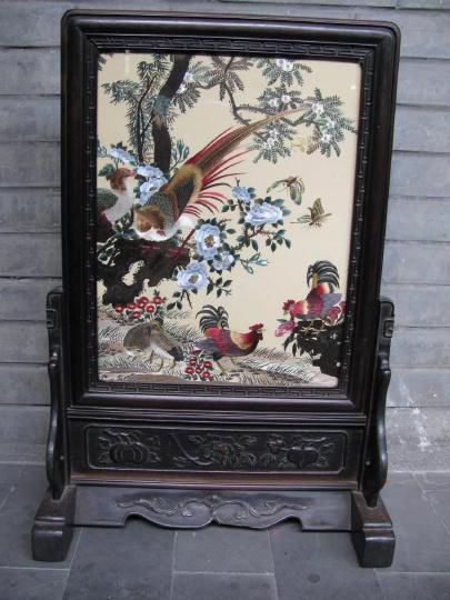 取材于古画,采用蜀绣的运针、辅针、切针、沙针、滚针、打籽针等针法绣制。树木花草层次分明、古朴自然,锦鸡蝴蝶色彩艳丽。