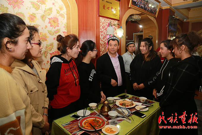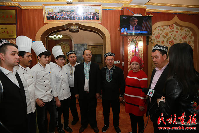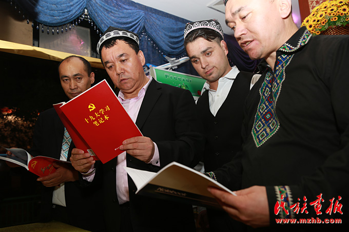新疆美食城店主阿地力·买买提带领维吾尔、哈萨克、回族等员工学习十九大报告