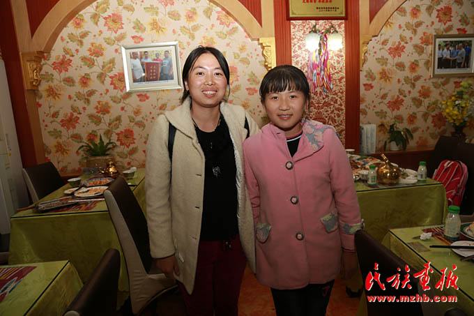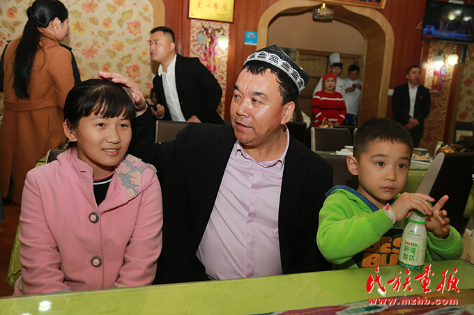 郑州市二七区新疆美食城店主阿地力·买买提热心公益事业,他已承诺帮助汉族学生徐文婷11岁(左) 等5人直到大学毕业