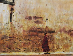 在丽江的束河古镇,他坐在小溪边,吹着清凉的微风,听着对面咖啡屋传来的低吟慢唱,心情舒畅地画着自己的画。很快,一幅《水边咖啡屋》就在这不经意间诞生了。在梅里雪山,早晚都能看到人们所说的日照金山的美景,打开窗户,暖阳透进来照在身上,就这样画着藏族人心中的神山,他觉得实在找不出还有比那一刻更美好的感觉了。
