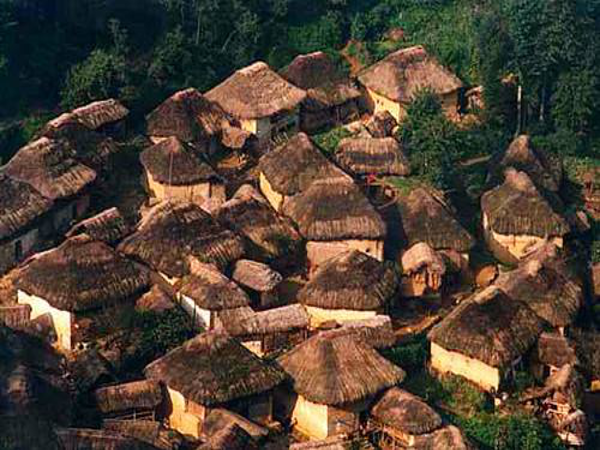蘑菇房,顾名思义,它状如蘑菇。房子的墙基用石料或砖块砌成,地上地下各有半米,在其上用夹板将土舂实一段段上移垒成墙,最后屋顶用多重茅草遮盖成四斜面。