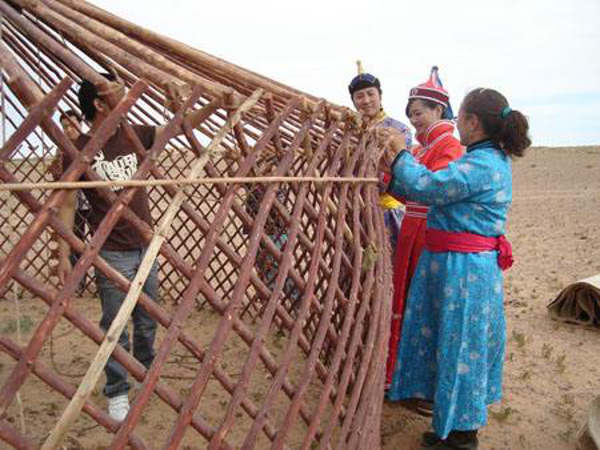 蒙古包主要由架木、苫毡、绳带三大部分组成。