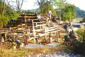 笔者看到的干栏式木楼和吊脚楼在使用的功能上相差无几,上层住人待客,楼下四壁用木板围挡,圈养畜禽,存放烧柴、农具和秋收临时堆放的粮食。猪圈靠里侧依柱围栏,其它空闲的地方打扫得干干净净,有的将织布机放在楼下明亮的地方。住房一般5间,两头两间是偏厦,中间3间是宽敞的堂屋,一头设火塘、土灶,为烤火、煮饭之处;另一头的中柱供临时设席敬神之用,也有的在板墙上设佛龛神位,供奉祖先;卧室依房柱用木板灵活隔间。大门有的开在房山墙一侧,也有开在中间的,皆登石阶、板梯而上。吊脚楼一栋挨着一栋,小巷道曲折狭窄,只容牵牛和顺向挑担通过。