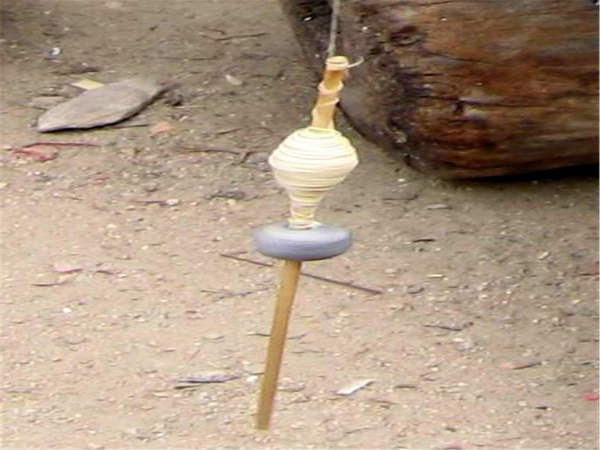 “纺”是把野生棉花或木棉花用绞棉机去除棉籽后捻成线,缠绕到手捻纺轮车上,包括错纱、配色、综线、攀花等。