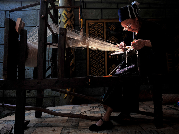 “织”是指使用踞腰织机,采用通经断纬的纺织方法织出各种花纹图案,在织布时,先手工挂经,绑住藤或树皮布腰带,用脚踩织机的经线木棍,席地而坐织布。织花是用黑色或蓝黑色做底线(经线),根据图案需要,将各种染色的线搭配,拉经线、投纬线(彩色线),用木刀打紧纬线,织出各种花纹图案。