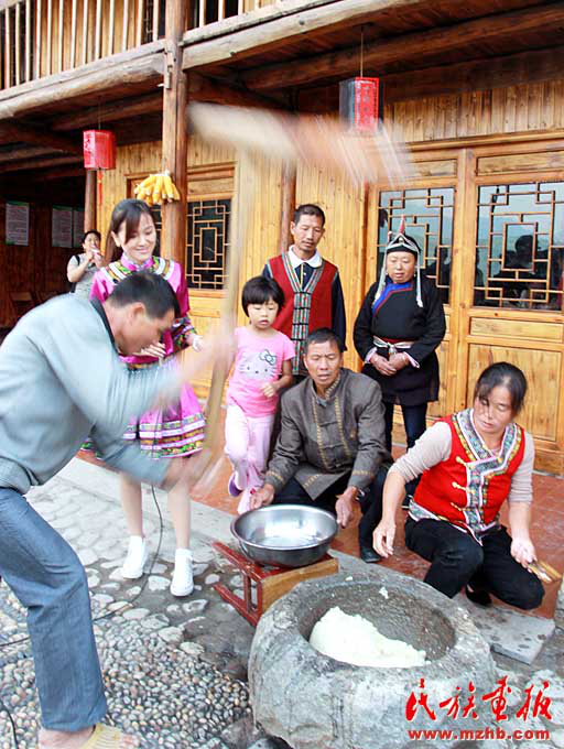 上午9时,李宝村“风情畲寨农家乐”已经闹腾开了。来自台州的一群游客转动石磨,做起了畲家特色菜肴“豆腐娘”。看着客人们兴奋的模样,“风情畲寨”老板雷林忠笑得合不拢嘴:“开寨以来天天客满,光是做‘豆腐娘’,一天就要给游客磨上几十斤豆子。”“这几天慕名而来的游客有六七十拨,全村8家农家乐都接待不过来。”指着停满了外来车辆的停车场,李宝村党支部书记雷刘东说:“还是那栋老房子、那些地和人,以前混个温饱,现在吆喝山水、卖文化,也能赚到金元宝。”