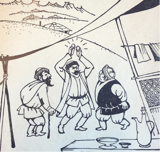 霍加纳斯尔赶紧过来给他们劝架,把可怜的穷汉拉到一旁,向掌柜的问道:“你为什么打他?”胖子气呼呼地说:“这个穷家伙不给钱就想跑,所以我才打他。”霍加纳斯尔又问:“他都吃你什么了?该给你多少钱?”掌柜的理直气壮地说:“他进了饭馆以后,掏出一块馕来,坐了很长的时间也不吃,一直坐到厨房的香味儿渗到他那块馕里以后,他才吃。当然他得给我钱了,我那饭菜的香味又不是白来的。”霍加纳斯尔说:“对呀!你有理。”然后回头问穷汉:“你说说你的理由吧!”