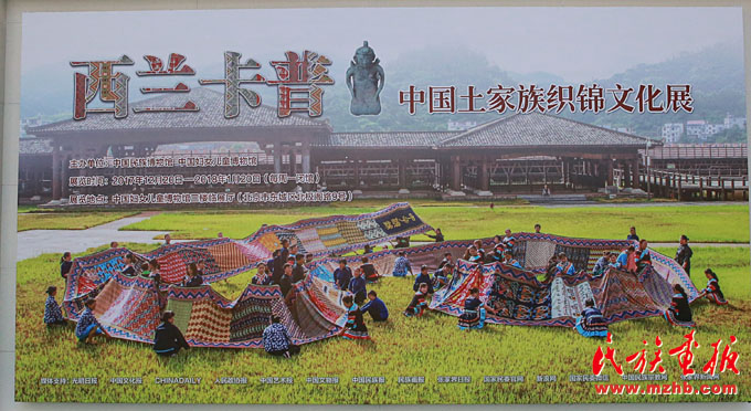 2017年12月20日,“西兰卡普——中国土家族织锦文化展”在北京中国妇女儿童博物馆开展。展览由中国民族博物馆和中国妇女儿童博物馆联袂主办,张家界市人民政府驻京办事处协办。展览开幕前举行了土家织锦文化小型座谈会,与会嘉宾从不同角度畅谈了土家织锦的艺术特色。中纪委驻财政部纪检组原组长、全国妇女手工编织协会副会长贺邦靖,国家新闻出版广电总局原党组成员、副局长宋昌明,中国作家协会主席团委员、中国少数民族作家学会常务副会长叶梅,张家界市委常委、宣传部长郭天保,张家界市副市长尚生龙,国家民委国际交流司原副司长吴金光,中国妇女儿童博物馆副馆长刘华彬、北京孔庙和国子监博物馆馆长吴志友等人参加了座谈会并参观展览。