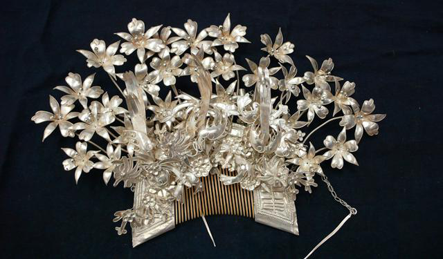 银凤冠和银花帽是头饰中的主要饰品,也是整套银饰系列之首,素有龙头凤尾之美称,其制作较为复杂,使用的小件饰品少则一百五十余件,多则达两百余件,价值昂贵。苗族银饰,如同苗族刺绣、织锦、蜡染等装饰物一样,是苗族支系相互区别的重要表征,不同地域的银饰有着不同的特征。