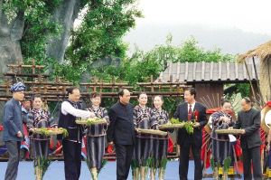 望谟布依寨老和小朋友迎接各位领导、朋友、嘉宾进入活动会场