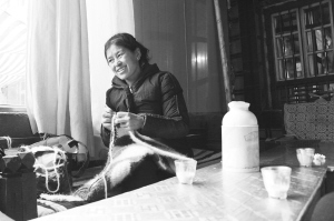 “一壶甜茶一下午。”勤劳的藏族妇女,手里的钩针穿梭在毛线之间,一下午就织好了一个马鞍坐片。