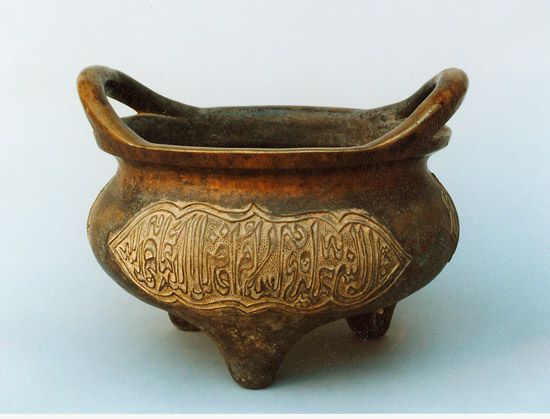 侈口、方唇、窄卷沿、矮束颈、扁鼓腹,口沿立一对桥形耳,底部以矮小的三乳足支撑整个炉身。外腹壁两大两小四组开光内均以珍珠纹为底,阳刻有阿拉伯文字,汉译为:“最贵的记主词(吉克尔)是念清真言(万物非主,唯有真主,穆罕默德是真主的使者)”,底款汉文四字篆书“宣德年制”。阿拉伯文构成此炉的主体纹饰,图案别致,内涵深奥,寓意独特,雕刻手法精细、娴熟,线条婉转流畅,自然雅致,具有韵律之美。该器物铜质精良,造型优美,工艺考究,将冶铸、雕刻技术与阿拉伯文书法绝妙融合,堪称回族文物中的珍品。