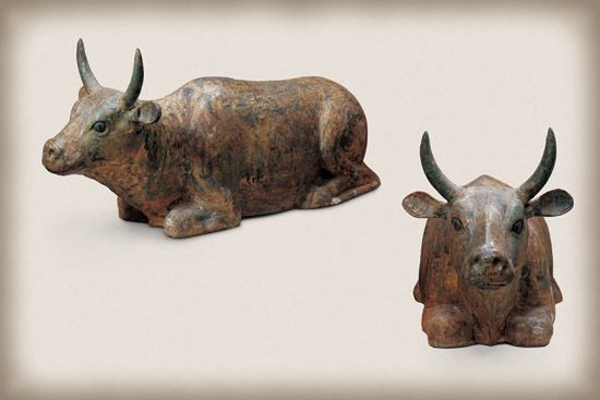 青铜铸造,中空,外表通体鎏金。牛屈肢而卧,双眸远眺,四肢有力,体态健壮,比例匀称,线条流畅,造型形象逼真,个体硕大。该铜牛制作时需要将冶炼、模具雕塑、浇铸、抛光和鎏金等工艺集于一体,真实地反映出西夏青铜铸造工艺的高超水平,是西夏金属工艺品的杰出代表。