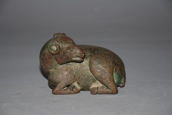 铜羊做蹲卧式,盘角,回首,两眼凝视,似乎闻声将起,体型肥硕,神态温驯、生动活泼,栩栩如生。在铸造上工匠利用传统的错金银工艺,用金丝银线镶嵌全身,凸显出羊首轮廓和纤细卷曲的绒毛,金光银彩交相辉映,更显得生气盎然。两汉时期不但继承了先秦时代已有的错金银技术,而且还有一定的创新,工艺更为精湛。