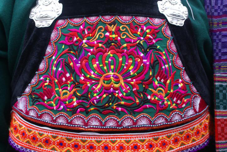 水族有养马赛马习俗,马尾绣应运而生。以丝线裹马尾刺绣制作图案的好处是马尾质地较硬,能使图案不易变形,马尾不易腐败变质,经久耐用;还有马尾上含有油脂成分,利于保养外围丝线光泽;另一奇特之处就是绣品上缀有形如古代钱币的铜饰,以红线穿贴于马尾绣片里,如星星点点的小花,除了做装饰外,水族同胞认为,铜有驱邪避凶的功能。在封建社会,铜是铸币之物,一些朝代严禁民间铸铜,马尾绣里却绣有铜饰,这充分体现了水族马尾绣的珍贵文化艺术价值。