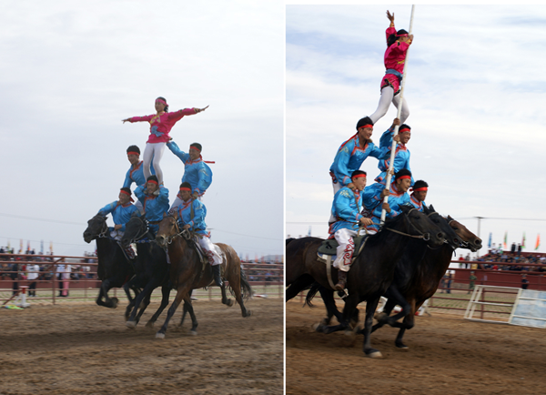 蒙古族的马术表演非常精彩,有很多项目。“跨越障碍”是在运动场跑道上每隔几十米设置一个高1米的跨栏。跑道终端立着一个直径约2米的火圈,矫健的坐骑从起跑线踏蹄起跑,越过跨栏,钻过火圈直达终点。“乘马斩劈”是在200-250米的距离之间树起十几个目标。骑手们手持马刀,疾驰如飞,经过一个个目标时举刀劈砍,刀起标落。“马上技巧”是由运动员们在飞驰的马背上做出各种造型动作。运动员一般八九岁就要在马术队接受严格的训练。技巧表演可分单项和多项,其中又包括单人单马、单人双马、双人双马和多人多马。一匹飞奔的马经过骑手身边,骑手可以突然抓住马鬃翻身上马,又会突然下马脚尖点地再跃上马背。其他技巧还有在马背上“空翻倒立”“侧方隐蔽”“楼里藏身”以及惊险的“马上叠罗汉”等表演【如图,刘军摄影,编者修剪合成两图】。