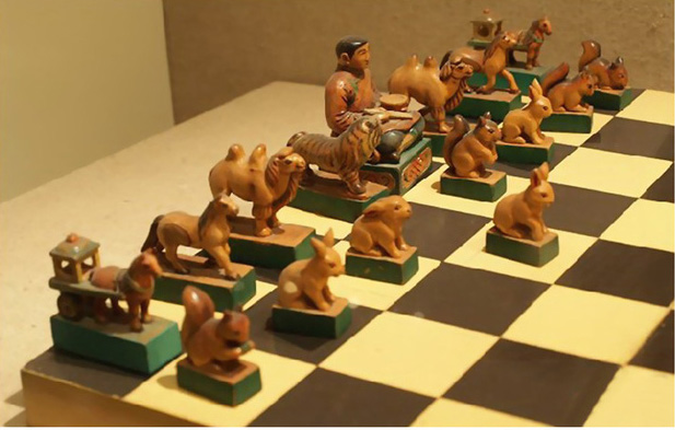 据清叶明澧《桥西杂记》载,蒙古象棋的棋制和着法乃:“局纵横九线,六十四卦。棋各十六枚:八卒、二车、二马、二象、一炮、一将,别以朱墨,将居中之右,炮居中之左,车,马、象左右列,卒横于前,棋局无河界,满局可行,所谓随水草以为畜牧也。其棋形而不字,将刻塔,崇象教也。象改驼或熊,迤北无象也。卒直行一卦至底,斜角食敌之在前者,去而复返,用同于车,嘉有功也。马横行六卦,驼可斜行八卦,因沙漠之地,驼行疾于马也。车行直线,进退自由。群子环击一塔,无路可出。始为败北”【刘军供图】。