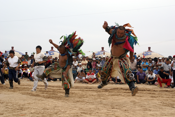 蒙古族摔跤(搏克)既不同于中国式摔跤,也不同于日本的相朴,其规则、方法、服装、场地等方面都有自己的特点。比赛规则和方法是:不分等级(不分年龄、不分体重),没有人数限制,只要是2、4、6、8、16、32、64、128等双数即可。所有选手由德高望重的裁判负责编排配对或抽签配对后上场。比赛实行单淘汰制,一跤定胜负,失败者不许再上场。每轮淘汰半数。裁判员发令后,双方握手致意,然后开始交锋,一般不限时间,可以采取勾、拉、踢、绊、推、抱、举等各种方法和技巧,但不能抱腿摔,也不准乱踢,更不能扯裤子,膝盖以上任何部位着地即为失败。摔跤手有专用服装,上身为牛皮或帆布制成的紧身半袖坎肩“昭德格”,下穿肥大的摔跤裤,脚蹬蒙古靴,颈上套五颜六色的布条项圈。比赛场地简单,只要有一片草坪或松软空地,观众席地围坐,摔跤手就可以在中间进行比赛。赛前,双方都有人高唱挑战歌,以造声势。摔跤手入场、退场时都要模仿虎步或鹰步动作,跳跃行进,威武雄壮。冠军获重奖,并在民间享有极高声誉【图为跳跃入场的摔跤手,刘军摄影】。