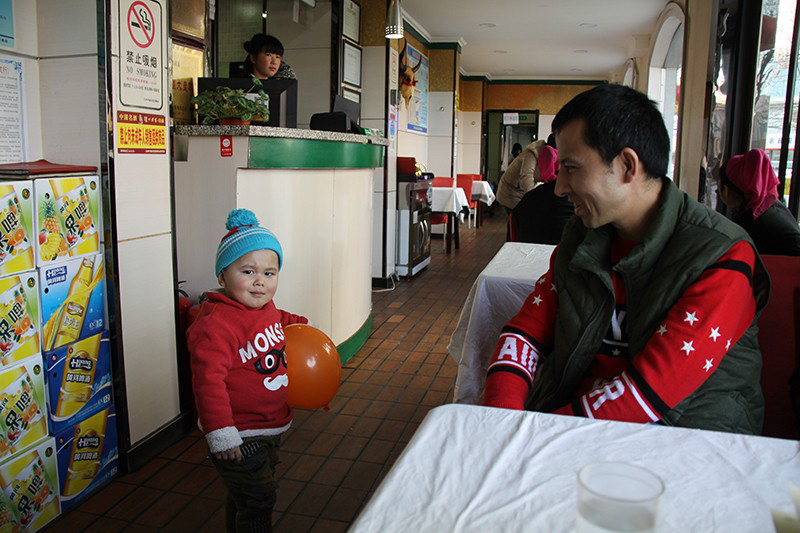 新疆村饭馆老板伊明江和他的孩子