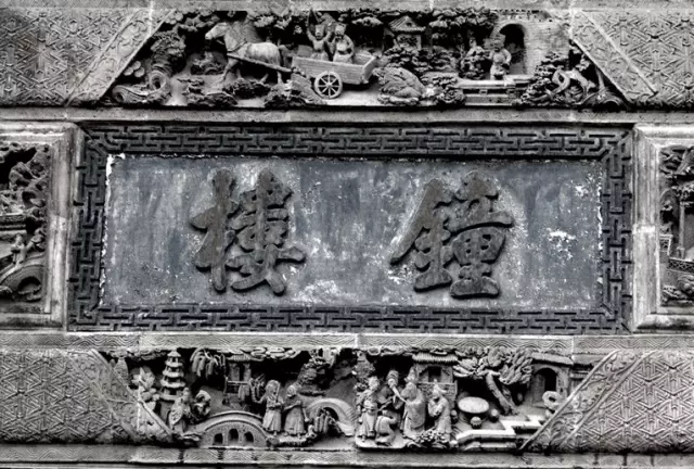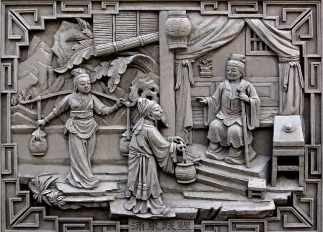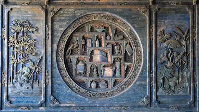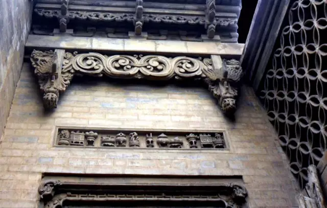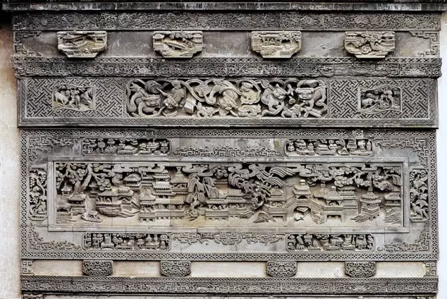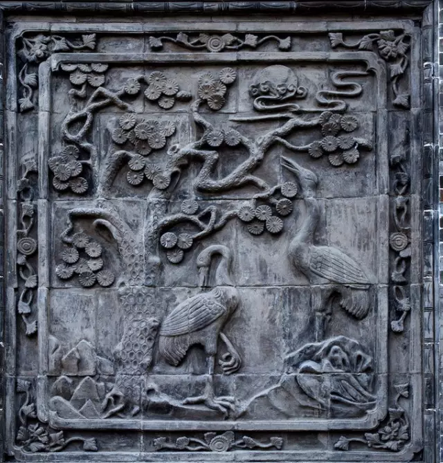 砖雕指在青砖上雕出山水、花卉、人物等图案,是古建筑雕刻中很重要的一种艺术形式。