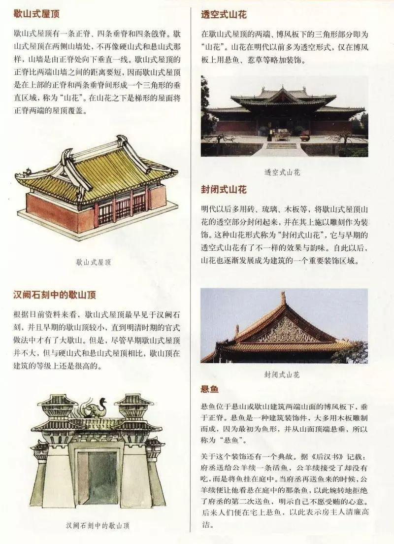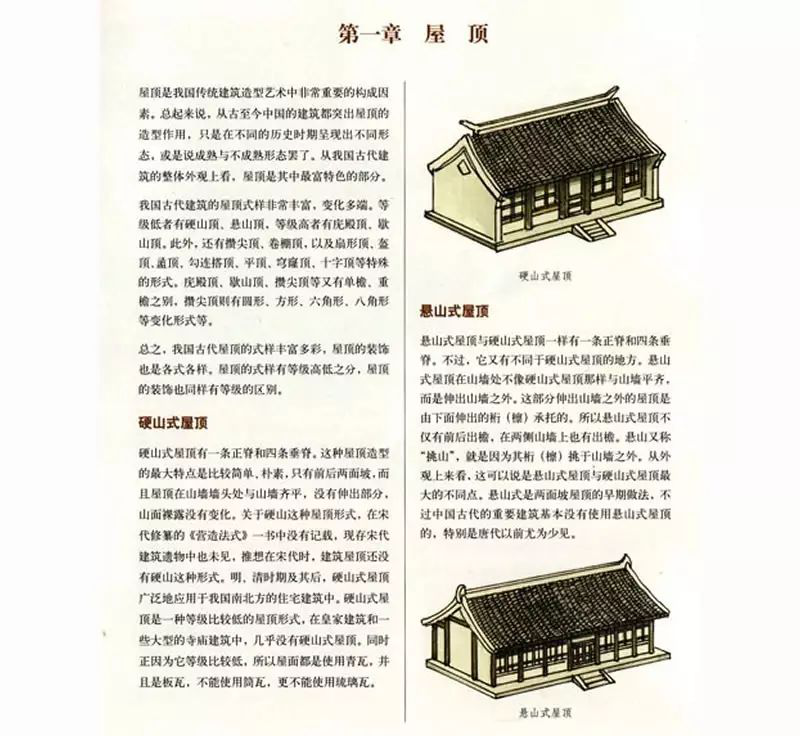 自从西周时代屋顶使用瓦件之后,人们对瓦当与屋脊逐渐重视,因为屋面两坡相交的地方必须把屋脊搭盖好,才不致漏雨,故该建筑形式逐渐形成,实物以汉代阙楼和唐代佛光寺大殿为早,远景设计研究院应用各种屋顶形式于古建筑设计中。