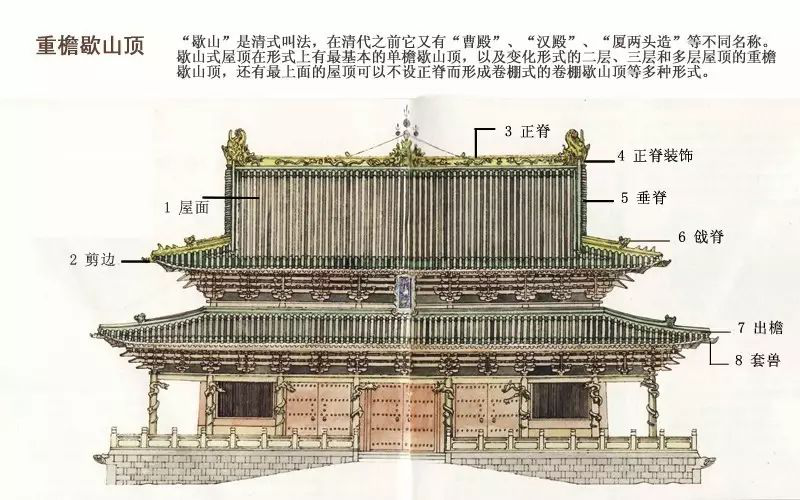 庑殿式屋顶是四面斜坡,有一条正脊和四条斜脊,且四个面都是曲面,又称四阿顶。重檐庑殿顶是古代建筑中 最高级的屋顶样式。一般用于皇宫,庙宇中最主要的大殿,可用单檐,特别隆重的用重檐,著名的如北京的太和殿。