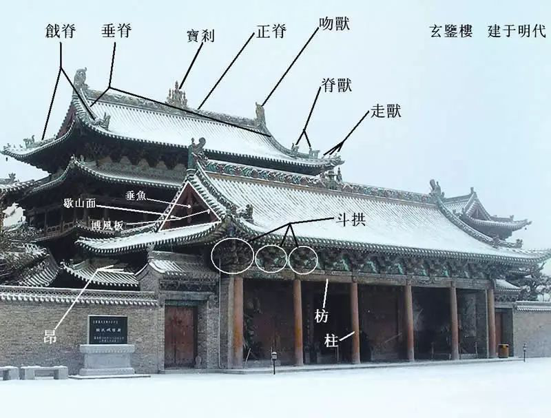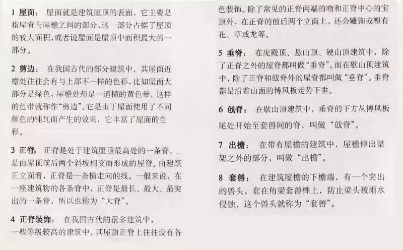 6. 戗脊:在歇山顶建筑中,垂脊的下方从博风板尾处开始至套兽间的脊,叫做“戗脊”。