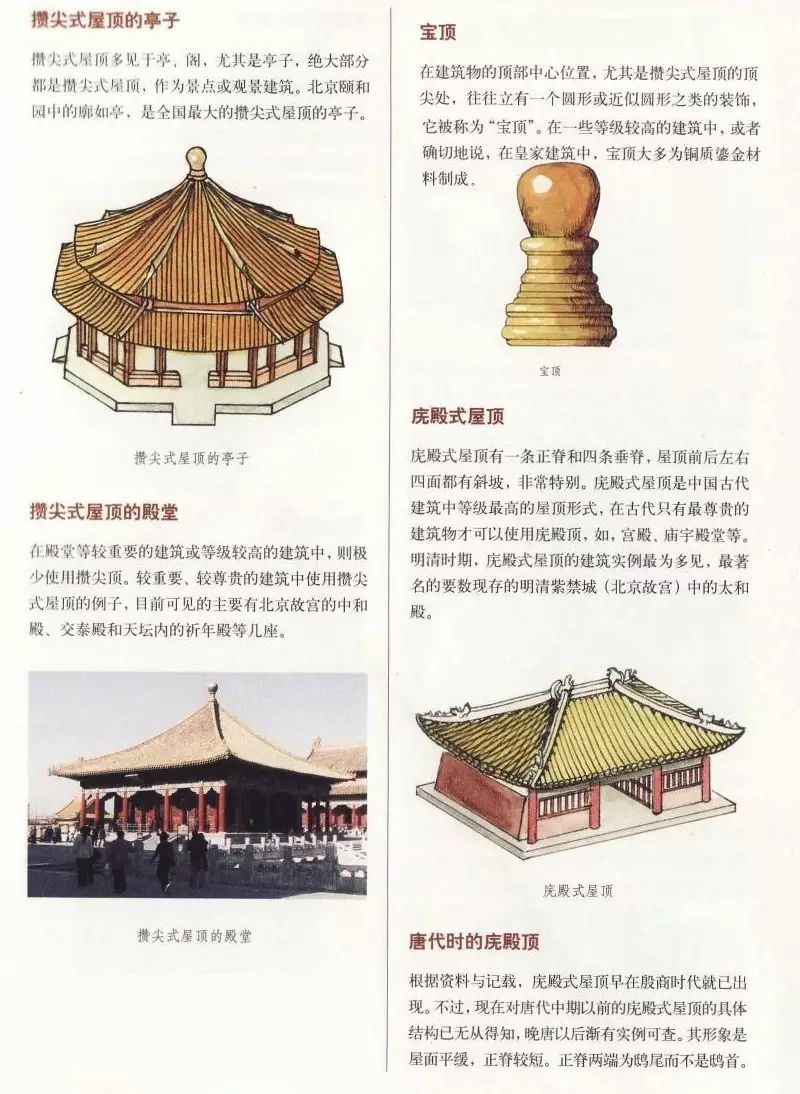 无正脊,只有垂脊,只应用于面积不大的楼、阁、亭、塔等,平面多为正多边形及圆形,顶部有宝顶。根据脊数多少,分三角攒尖顶、四角攒尖顶、六角攒尖顶、八角攒尖顶。此外,还有圆角攒尖顶,也就是无垂脊。攒尖顶多作为景点或景观建筑,如颐和园的郭如亭、丽江黑龙潭公园等。在殿堂等较重要的建筑或等级较高的建筑中,极少使用攒尖顶,而故宫的中和殿、交泰殿和天坛内的祈年殿等却使用的是攒尖顶。攒尖顶有单檐、重檐之分。