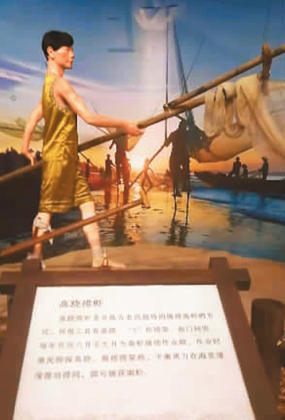 广西东兴市京族文化传承与保护中心展出的京族捕捞传统——高跷捞虾,也就是现在学生们学习的高脚罾。记者 庞革平摄