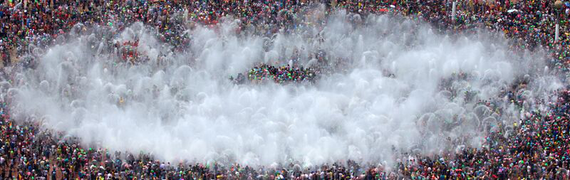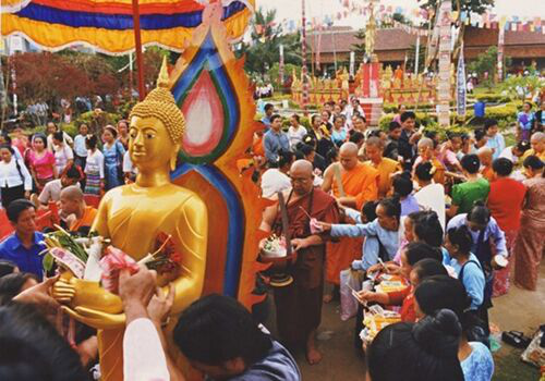 新年泼水是一种礼节,既隆重又热闹。除夕那天,人们先到佛寺里,取来最干净的清泉(江河)水,采来最香的鲜花,把花瓣撒在水中,每人取一瓢,用含着花香的清水给佛像沐浴(象征给佛祖沐浴),祈求来年平安。仪式举行完后,人们用树枝和鲜花浸水相互淋洒,以示祝福,口中不断地说着“萨瓦沙丽”(吉祥安康)“如利京宛”(幸福健康)。对长者只能轻轻地淋洒在肩和背上,表示尊重。到佛寺外和街上,年轻人们就可以泼水狂欢,以示祝福和欢乐。