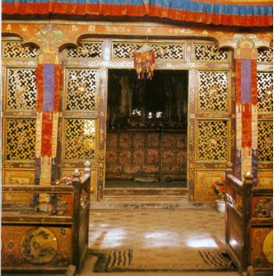 大门由于它的位置所在不应该列入室内装饰,但它与室内装饰息息相关,连成一体,故我们把它当作室内装饰在这儿加以介绍。门框装饰包含门框本身、门楣、门楣上的屋檐、门板等。藏族建筑大门装饰十分讲究,从屋檐到门坎都用雕、绘的手段充分加以装饰。屋檐用两道方本间隔排列,上盖青石片和黄土筑成底小头大的形状,它不仅有美观的装饰效果,而且起到防水作用。屋檐下是门楣,门楣上彩绘各种图案,门框的木构件上雕刻莲花花瓣和累卷叠函凹凸方格图案,这种图案处理形式大部分民居大门大同小异。门板为单开式,板门为了加固起见上、下分层钉铁条。门板一般涂单一色,不作绘画处理。除了这些装饰以外,门相上挂短绉帘,门框左右边缘墙上涂两道黑色竖条,每年过年前短绉帘要弃旧换新,黑色竖条与粉刷外墙一道重新涂漆,这是一般民居门框装饰。寺庙门框装饰较为复杂,门楣的间隔方木上加一层雕刻动物头像的木雕作品排成一行,装饰门楣这一板块,门框木构件多则六、七层,层层雕刻各种图案,可见其讲究程度。寺庙门板大多是对开式,用铁条包装门边缘,中间分层钉铁条,涂一层单一的颜色,特殊殿堂如扩法神殿大门门板上要进行绘画处理,寺庙大门讲究厚重、庄严。无论是民居大门还是寺庙大门,其装饰要求与室内梁柱装饰相协调,从颜色的运用到雕刻内容都要做到这一点,保持内外装饰效果统一。