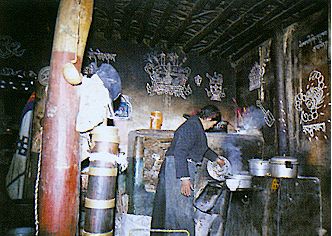 藏族民居室内装饰讲究工整、华丽、亮堂,上至天花板下至与地板相接的墙角都采用雕刻、彩绘等艺术手段加以装点,尤其是横梁、柱头和大门等木结构空间是充分展示装饰才能的地方,在这里装饰效果尽其所能。此外寺庙重点佛堂,回廊墙壁上绘制彩画,这也是一种重要的装饰手段,而百姓居室内的墙壁上用绘制花卉、彩条来取得装饰效果。