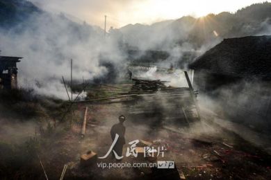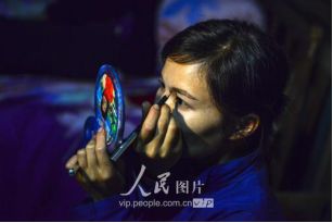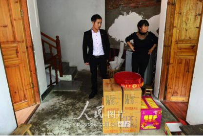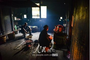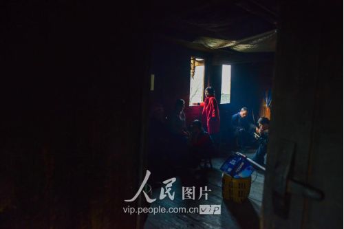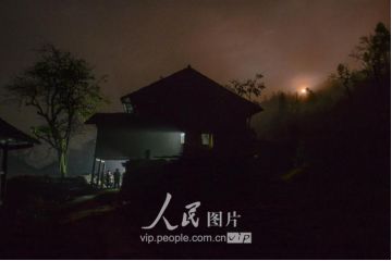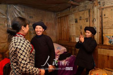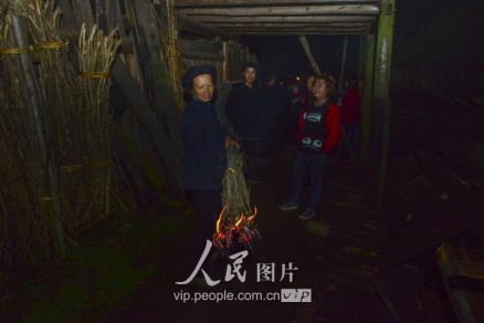 一般要到快过春节的时候,男方家才专门请人去接女方来洗糯米、打糍粑,新娘方能在夫家住上一夜;在来年农忙时节,又接女方来帮忙,夜里仍不能在男方家留宿,帮完忙当晚即回去,只有待到女方有身孕后,新娘才到夫家长住。图为11月16日夜,新娘潘芝银家为准备婚礼,灯火彻夜长明。