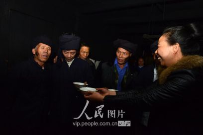 11月17日凌晨,新娘家的亲戚在“发亲”前与新郎家派来的“关亲客”对歌敬酒。