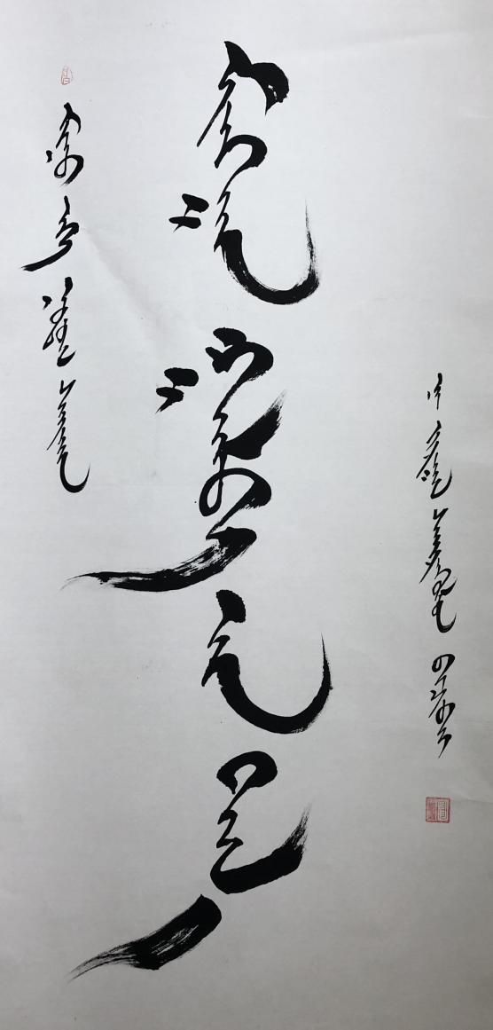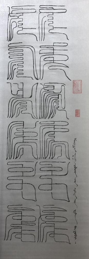 苏永布文字。1686年由喀尔喀高僧,一世咱那巴咱尔创制。这种文字源自梵文兰札体字母,主要用于宗教和装饰目的。由于字体繁难,并未在民间流行。