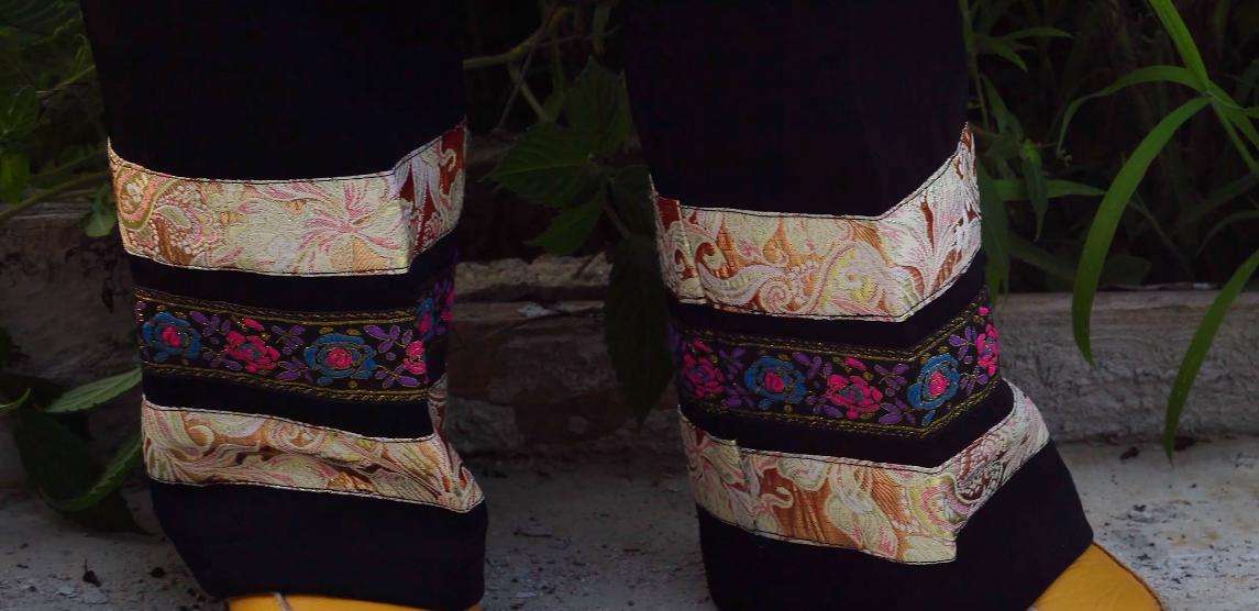 传统服饰是由布依族传统工艺制作而成,其上衣以蓝色打底的斜襟衣和白色打底的围腰为主,上衣对襟处绣有花草图案作为装饰,围腰上部也绣有花草图案作为描边。下身则以黑色长裤和灰色长裤为主,衣饰上所有的雕花刺绣图案全部出自之手。多从市场上购买。其上身对襟处和围腰上部也绣有花纹图案,但是这些花纹图案则是现代机器之功,下身以黑色打底的长裤为主,在裤脚处绣有花草图案,上板村布依族女性们还有一个习惯,就是不管是穿戴传统服饰还是现代服饰都会戴有黑色圆帽。