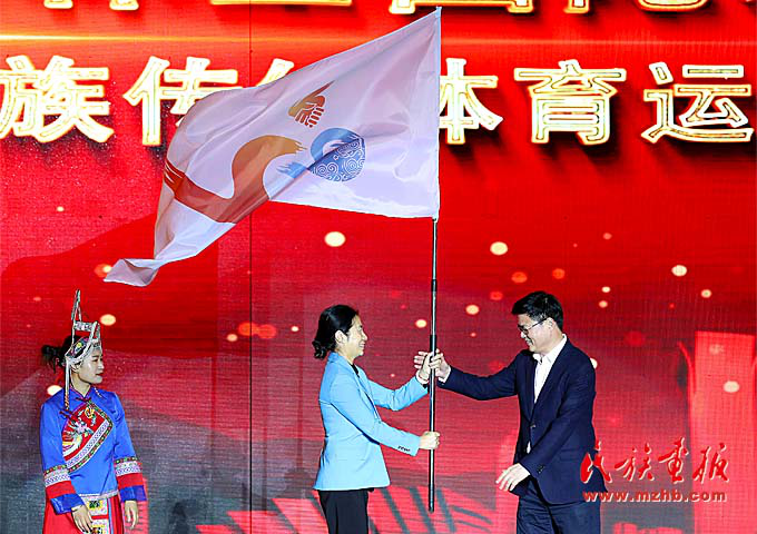 国家民委监督检查司司长隋青向运动会授旗。