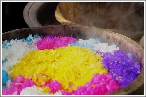 节日之前,苗族妇女就从山上采集枫叶和野榛叶,用铁锅煮开,倒进盆子,冷却后,将白花花的糯米放入盆子浸泡。节日当天早上,苗族妇女们早早起来,将装有染色糯米的木箕放在三脚架的铁锅上,烧起火慢慢地蒸。约一个小时过后,木箕里的糯米蒸熟成糯米饭,散发满屋的芳香。这时,苗族妇女就将糯米饭倒进饭盆,用手前后翻转,直到糯米饭里的水蒸气全部散发。