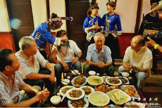 西行音乐公路之旅行至广南,当地企业为让旅行团队充分了解广南的饮食文化及人文风俗,经过多方走访,把广南土司后代、地主大户后代等曾经享受过土司盛宴的老人集在一起,共同研究,精心准备,聘请当地名厨,制作出消失48年之久的土司盛宴——“三滴水”。