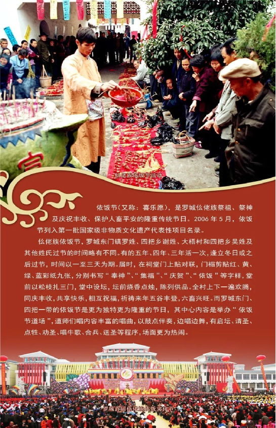 依饭节,仫佬挨语叫“做依饭”、“敬依饭公爷”、“还祖选愿”、“喜乐愿”,意为“向祖先还愿”。依饭节是仫佬族祈神保佑丰收、人丁安泰的传统节日,带有强烈的感恩和祝愿色彩。每逢辰且末之年的冬至前后举行,持续3~5天。仫佬族以血缘聚居,同姓一个宗族,同一个宗族的分支谓之“冬”。过依饭节,一般以“冬”为单位轮流备办,需准备的物品有猪、羊、鸡、鸭、鱼、米、酒等。