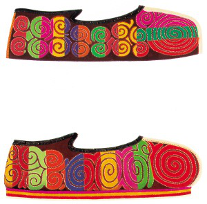 羌族男女皆穿羊皮坎肩和宽大袍衫、系腰带,脚穿云云鞋,女子系绣花围裙和飘带,戴绣花头帕。其中刺绣精美的云云鞋可以代表羌族刺绣的艺术水平,羊角花纹是云云鞋的主要纹饰,因其线条流畅如行云,故得名云云鞋。其实,这与羌人崇拜天神的信仰有关,天神就居住在高高的云空之中。此外,羊角纹还体现了羌人曾以羊为图腾的古老信仰。关于云云鞋还有个传说:相传,一个生活在湖泊中的鲤鱼仙子看见放牧的羌族少年赤脚,十分心疼,于是摘下一朵白云彩,折来一束羊角花,做成绣鞋相赠。后来他们相爱了,成了一对最幸福的人。从此这种有着羊角花纹的云云鞋就成了爱情的象征,羌族民间云云鞋也多作为情感的信物赠送意中人。千百年来,羌族刺绣就这么把美丽点缀在生活中,比传说和记忆更生动美好。