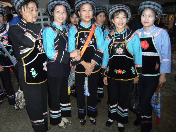 西南地区的服饰分布地区包括贵州省黔南布依族苗族自治州罗甸,黔西南州望谟、册亨、贞丰、安龙、兴义、兴仁、安顺市的镇宁、关岭、紫云三县的南部以及云南省罗平等县(市),基本上都属于布依语第一土语区。这个地区妇女普遍穿大襟衣、长裤脚。衣服的盘肩、袖口、襟沿镶有兰干。裤脚为大褶边,或蓝色裤脚镶一截青布和兰干。衣服的长短和裤脚的大小,各地区都不相同。册亨一带衣服较短,裤脚短小,包花格长帕,胸颈挂彩珠项圈,手套玉石或骨制手镯;望谟一带青年妇女把花格帕折叠后缠戴;贞丰一带的衣服较长,裤脚不折边,青年和老年妇女基本相同,但青年妇女包的花帕形状如牛角(人称“牛角帕”);靠近北部地区,衣裤都较长,而且不镶兰干,衣裤和帕子多为青色;安龙、兴义一带则多包白帕,衣裤亦不镶兰干;西南一带地区衣裤已渐不镶兰干,但还穿自织的土布衣服,头上还包花格帕,一些地区与汉族妇女装束完全一样了。