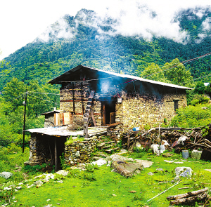 房屋大都是3层,上层存放干草和秸杆,下层关养牲畜,中间一层是居室。居室用木板隔间,里间较小是已婚子女住的,外间宽敞,是多功能堂屋。临窗处设火塘,以利排烟,是家庭生活中心和待客之处。火塘上架着硕大的铁三角架,上面是六七厘米宽的铁板圈,擦得铮亮,能烤制食物。墙角处供奉佛像,摆放领袖像。房门安设木锁,用十几厘米的木钥匙开启,都是由硬木刻制,光滑耐用。