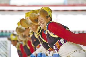 在西藏昌都市芒康县,众多演员同台献艺,表演国家级非物质文化遗产——弦子舞。 孙非摄