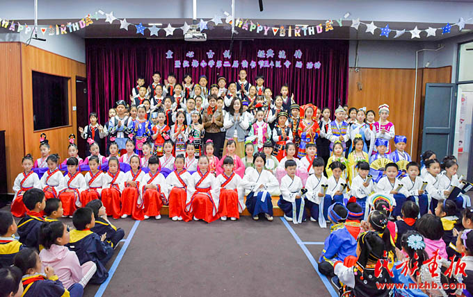 同一天下午,一场精彩的T台秀在上海市闵行区梅陇镇弘梅小学上演。小学生们身着民族服装亮相,动感的音乐、精彩的表演,将“民族团结一家亲”的理念演绎得生动活泼。学校布置的民族文化墙上,展示了我国56个民族的风土人情,营造了多姿多彩的民族文化氛围,让民族特色文化陪伴在学生身边。